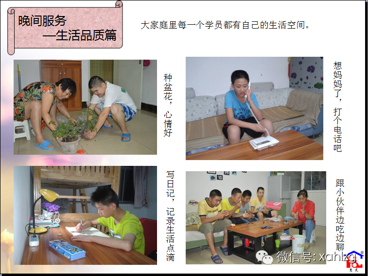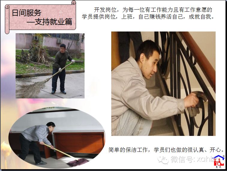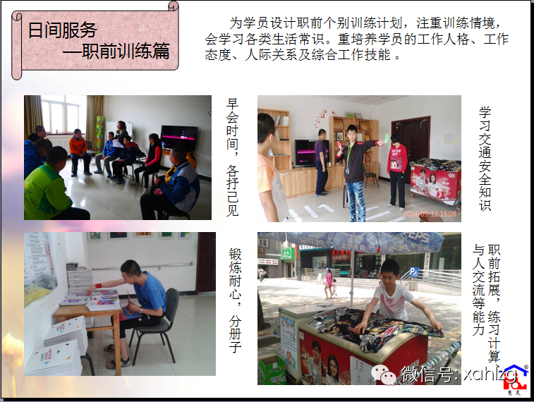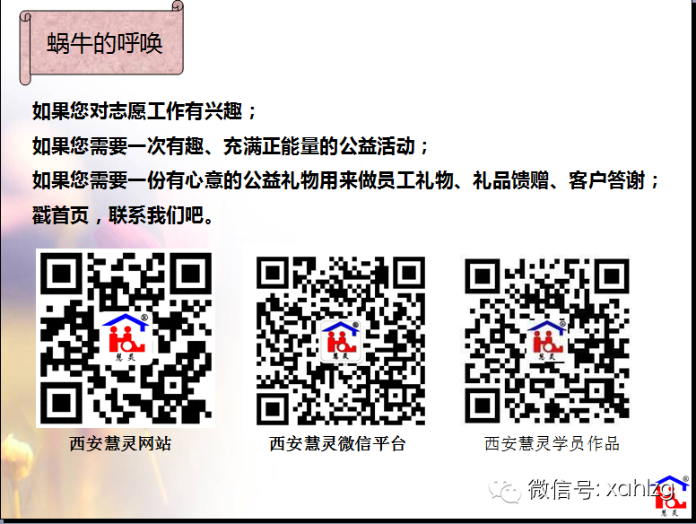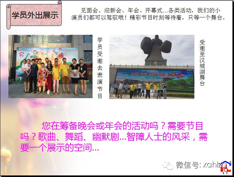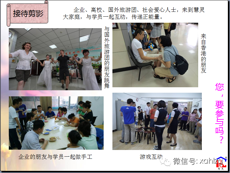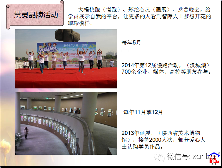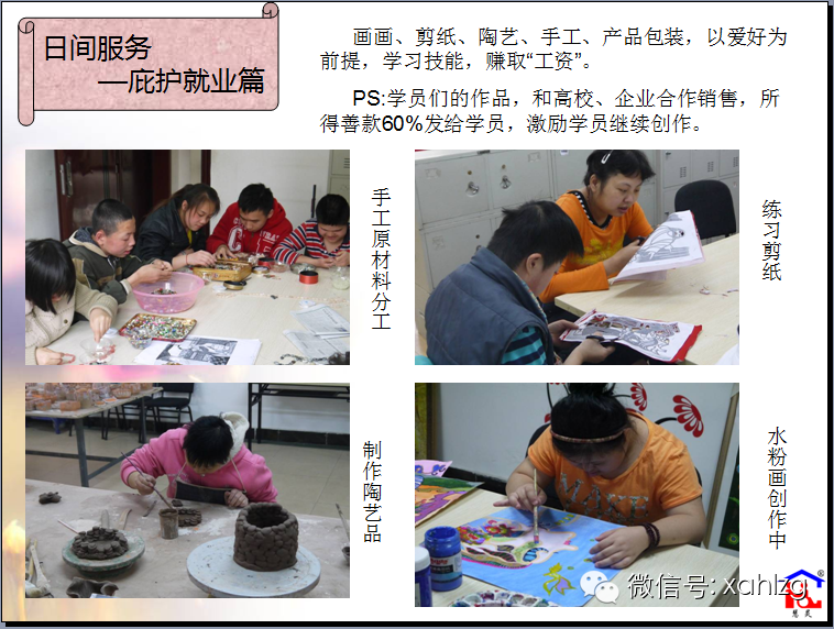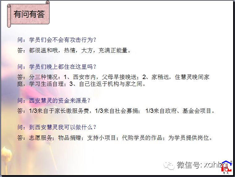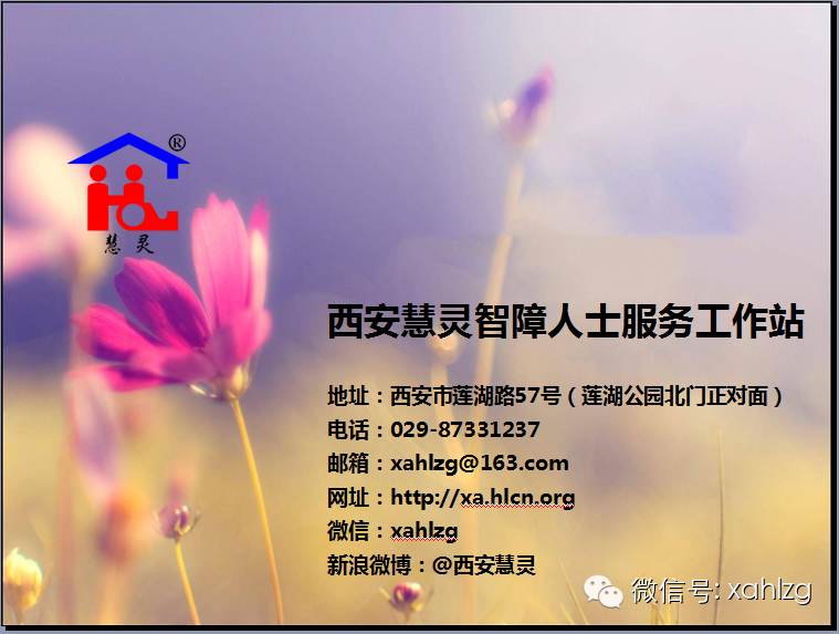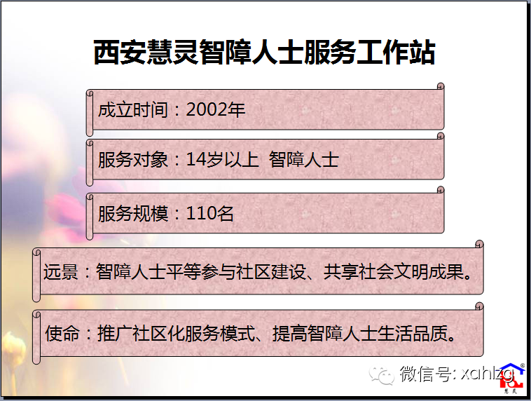 西安慧灵智障人士服务工作站是通过西安市民政局注册的民办非企业单位(NGO),自2002年成立以来,一直从事14岁以上智障人士社区服务,以“推广社区化服务模式,提高智障人士生活品质”为使命,秉承“智障人士平等参与社区建设,共享社会文明成果”的远景,采用开放式的社区化服务模式,利用社区资源,为智障人士提供社区化活动、晚间家庭住宿、职前培训、庇护工作坊、支持性就业、艺术调理等服务方式,为智障人士提供参与社会,挖掘潜能、提升能力的机会。同时开展家长减压、家长培训、亲子活动、喘息服务等,通过这些服务,为智障人士的家庭减轻负担。西安慧灵也成为国内多所大学社会工作专业学生的实习基地。现服务智障人士110名,员工团队40人,其中社工专业背景15人。