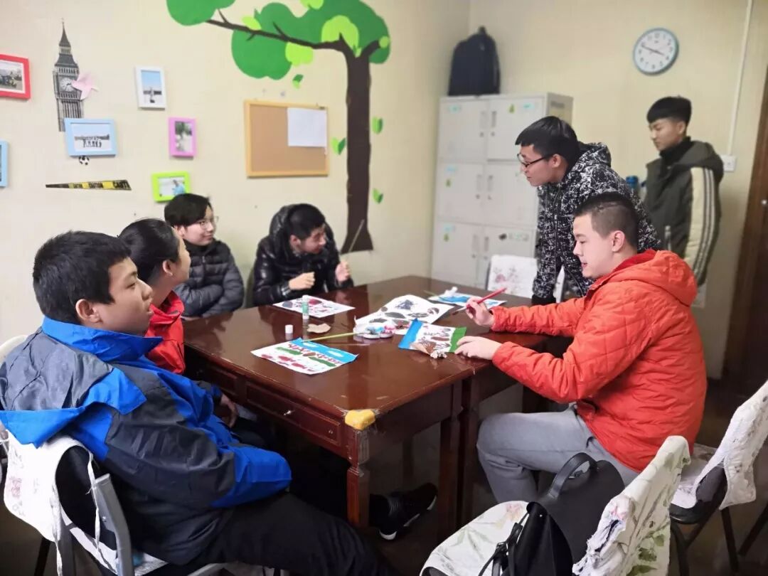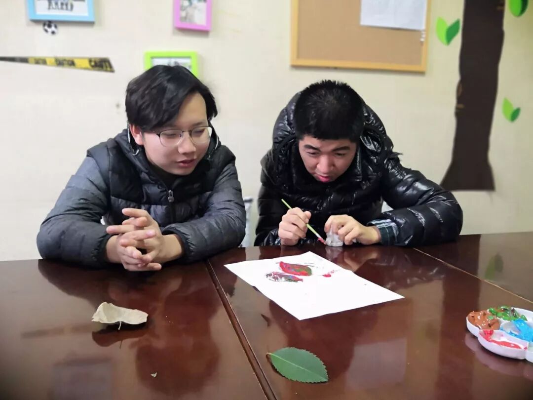 来自新伙伴的创意总是格外吸引学员们的注意,陕科大的学生们从学校收集到各种各样不同的树叶,准备了颜料画笔,用落叶记录秋音,用画笔谱绘爱心,陪伴慧灵的学员们度过了一段美好的时光。