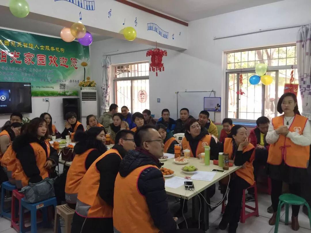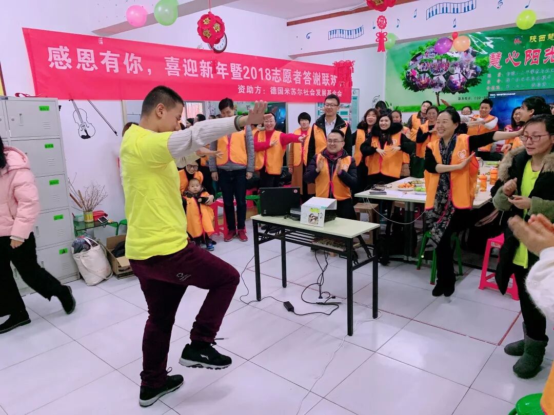2019年1月9日,陕西尚善公益发展中心组织26名志愿者前往莲湖区慧心智障人士阳光家园,与这里的23名“蜗牛”学员一起喜迎2019,欢度美好志愿时光。