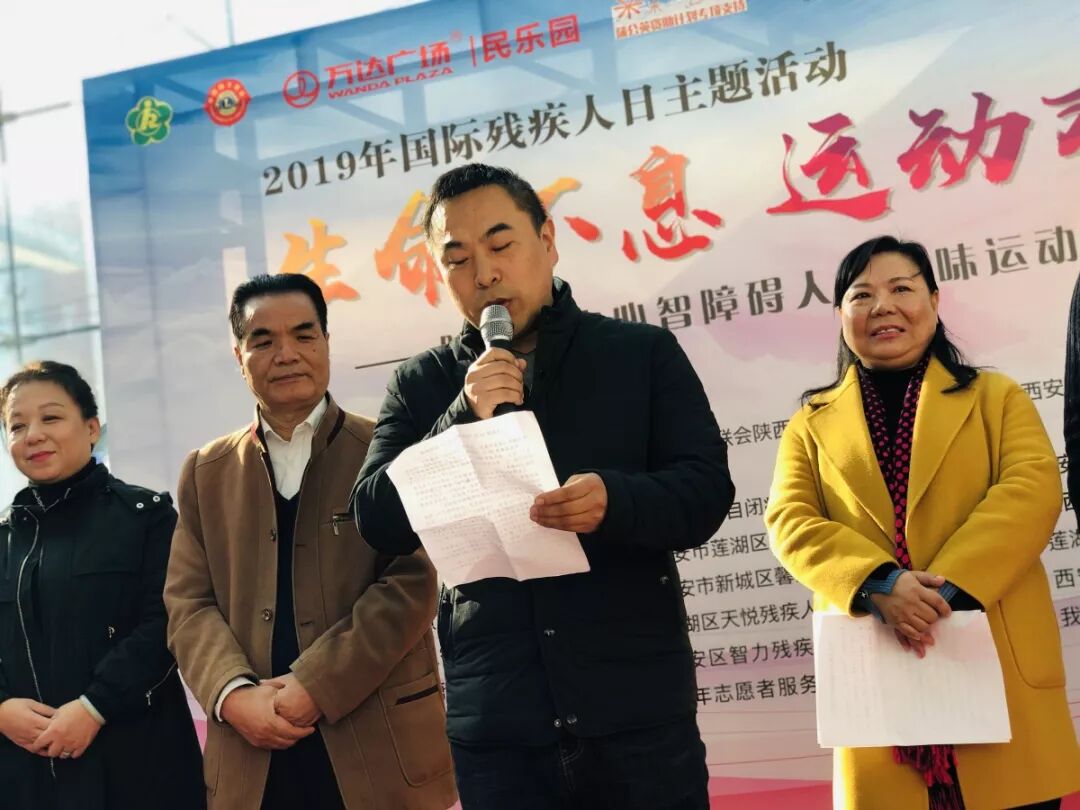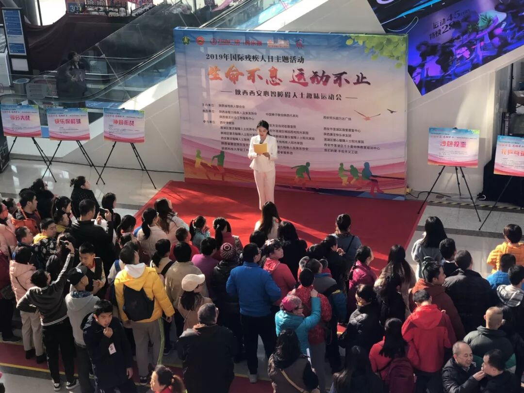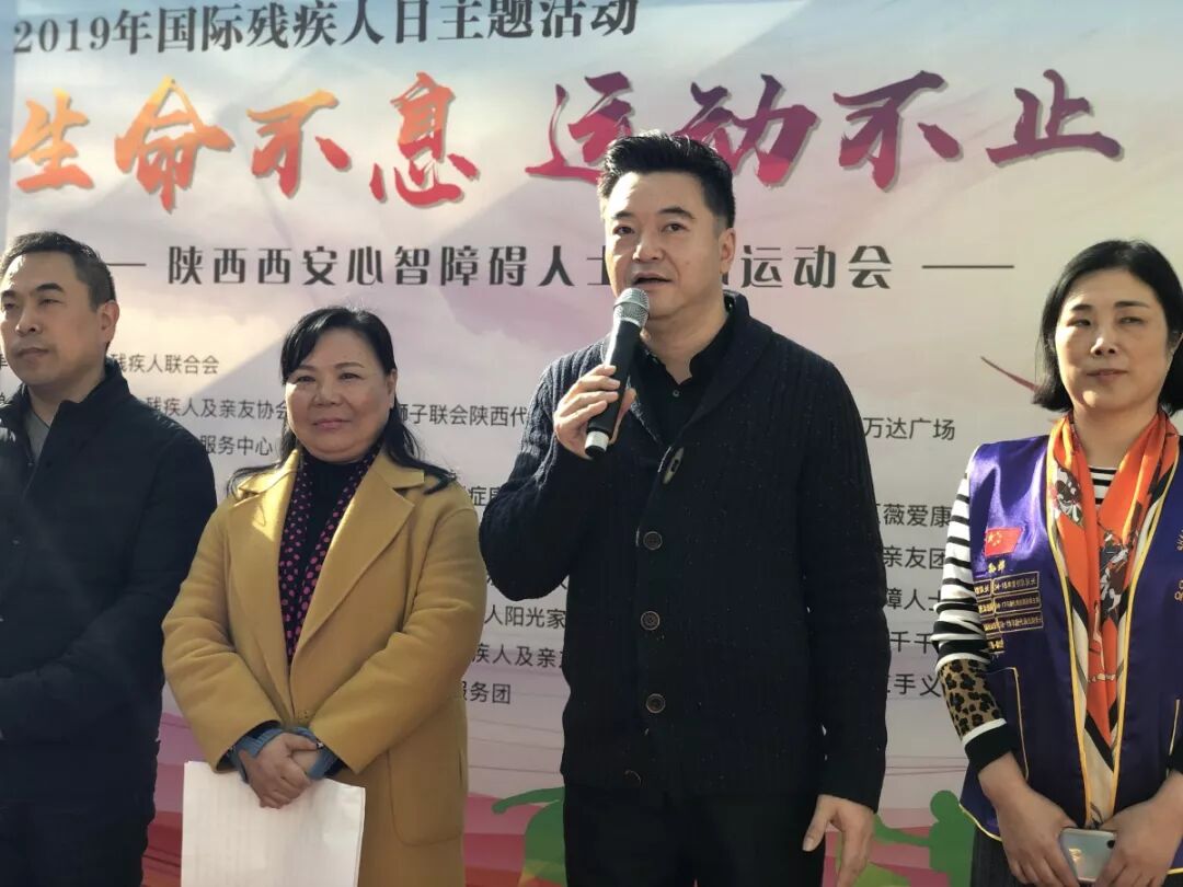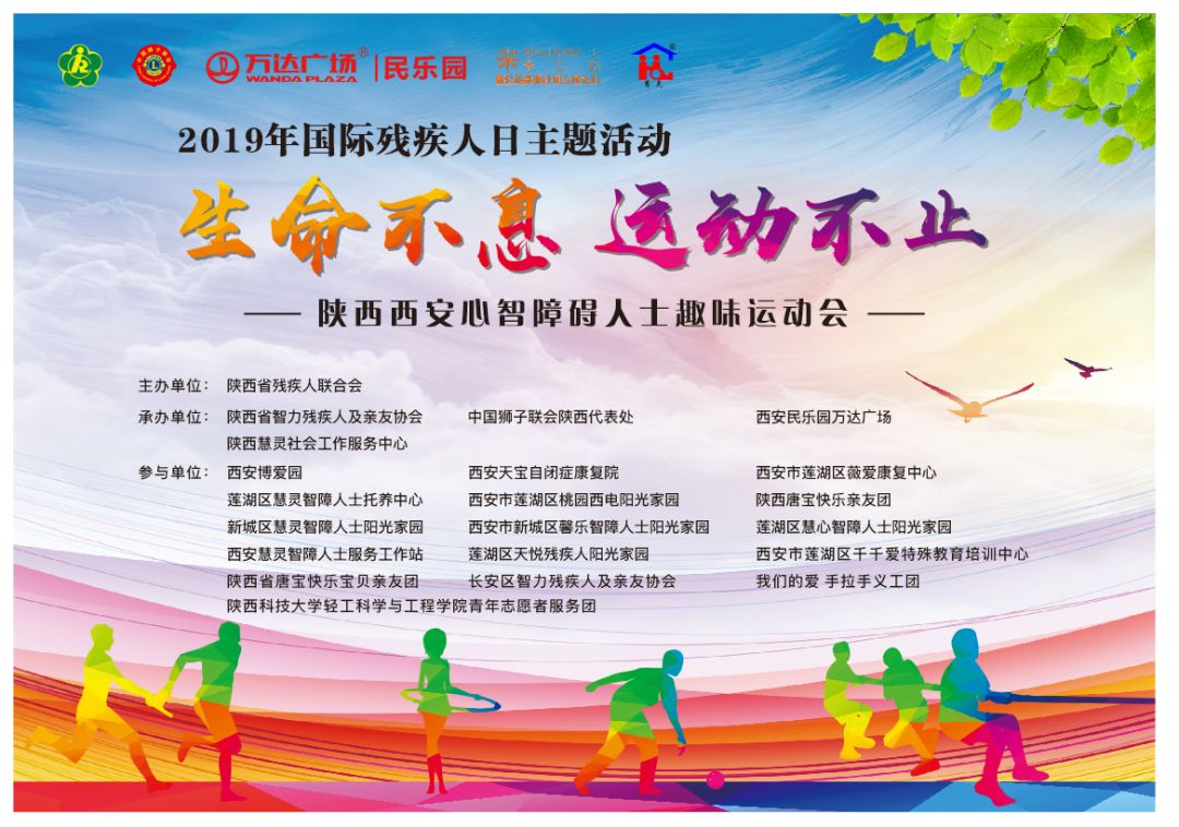 2019年12月3日,由陕西省残疾人联合会主办,陕西省智力残疾人及亲友协会、陕西慧灵社会工作服务中心、中国狮子联会陕西代表处、西安民乐园万达广场承办的2019年国际残疾人日主题活动——生命不息运动不止陕西西安心智障碍人士趣味运动会在西安民乐园万达广场如火如荼的拉开序幕。出席活动的领导有陕西省残联组联部副主任帅战民、陕西省智力残疾人及亲友协会主席杨琪、中国狮子联合陕西代表处主任王谨等。